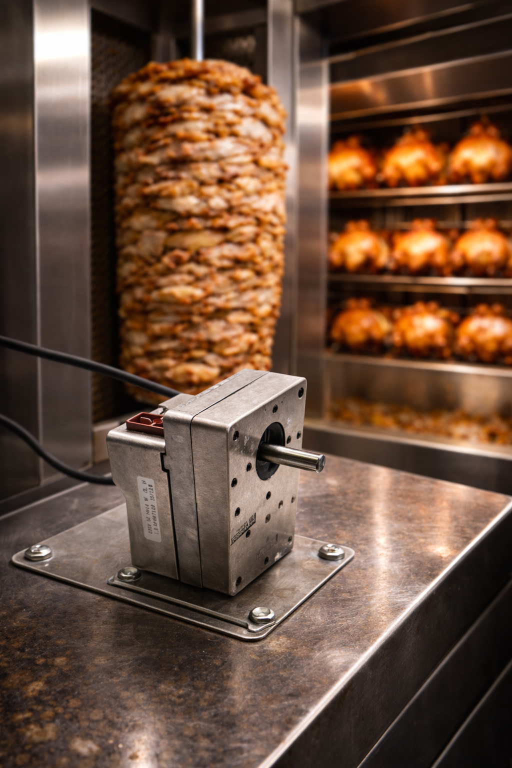 מיועד לסיבוב שיפוד הבשר במתקני שווארמה, מתקני גריל עוף ותנורים מקצועיים