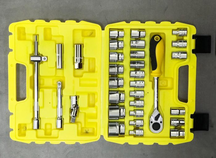סט כלי עבודה הכולל מפתח רצ'ט, בוקסות ואביזרים נוספים.